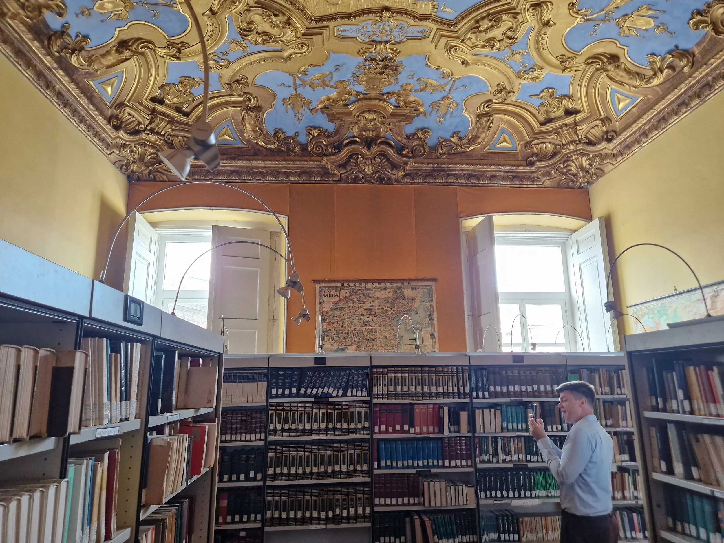 John takes photos of some rare books in the extravagantly decorated university library.